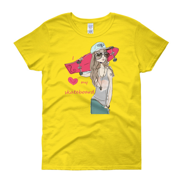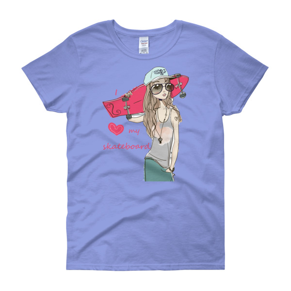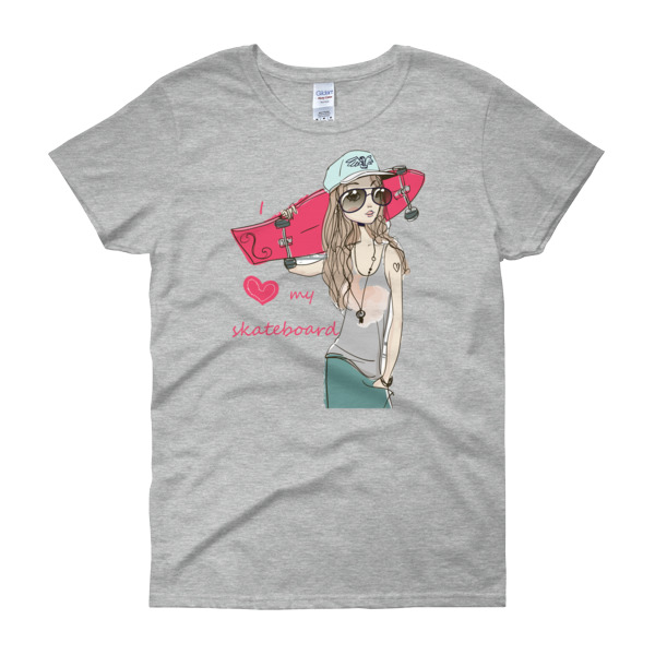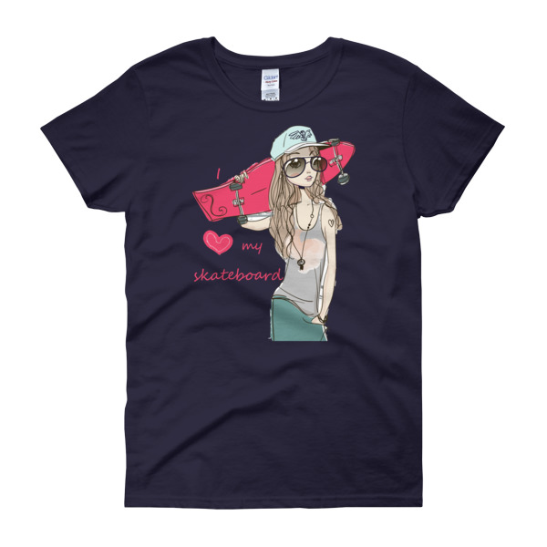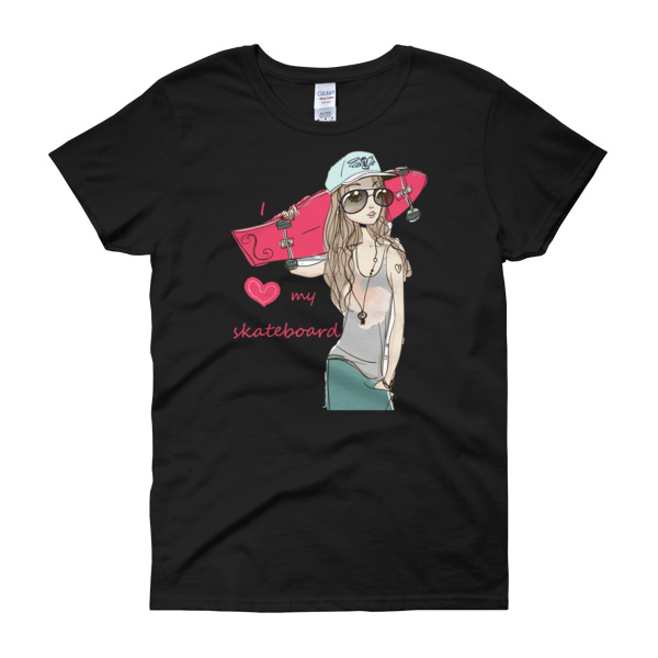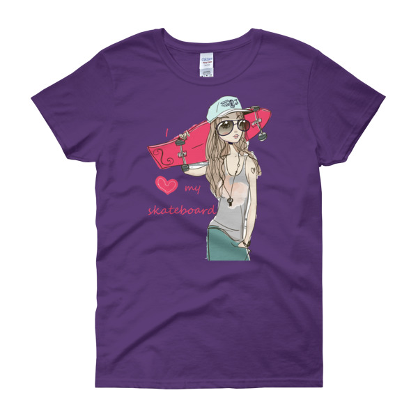 I love my skateboard T shirt. Show your passion for skateboarding. Limited Edition T shirt. Grab one while they last. A heavy cotton, classic fit ladies scoop neck t-shirt.